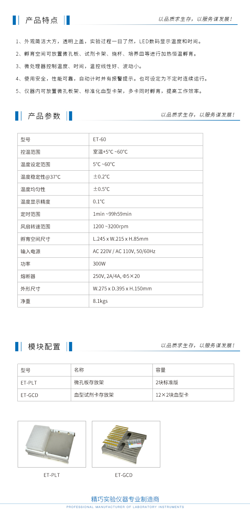 ET-60恒溫孵育器產(chǎn)品型號:ET-60產(chǎn)品描述:ET-60恒溫孵育器采用微處理技術(shù)結(jié)合PID控制方式而形成的多用途恒溫孵育器。適用于酶標(biāo)板、細(xì)胞培養(yǎng)板、血型試劑卡、燒杯、培養(yǎng)皿等載體內(nèi)溶液在設(shè)定溫度下進(jìn)行培養(yǎng)孵育。